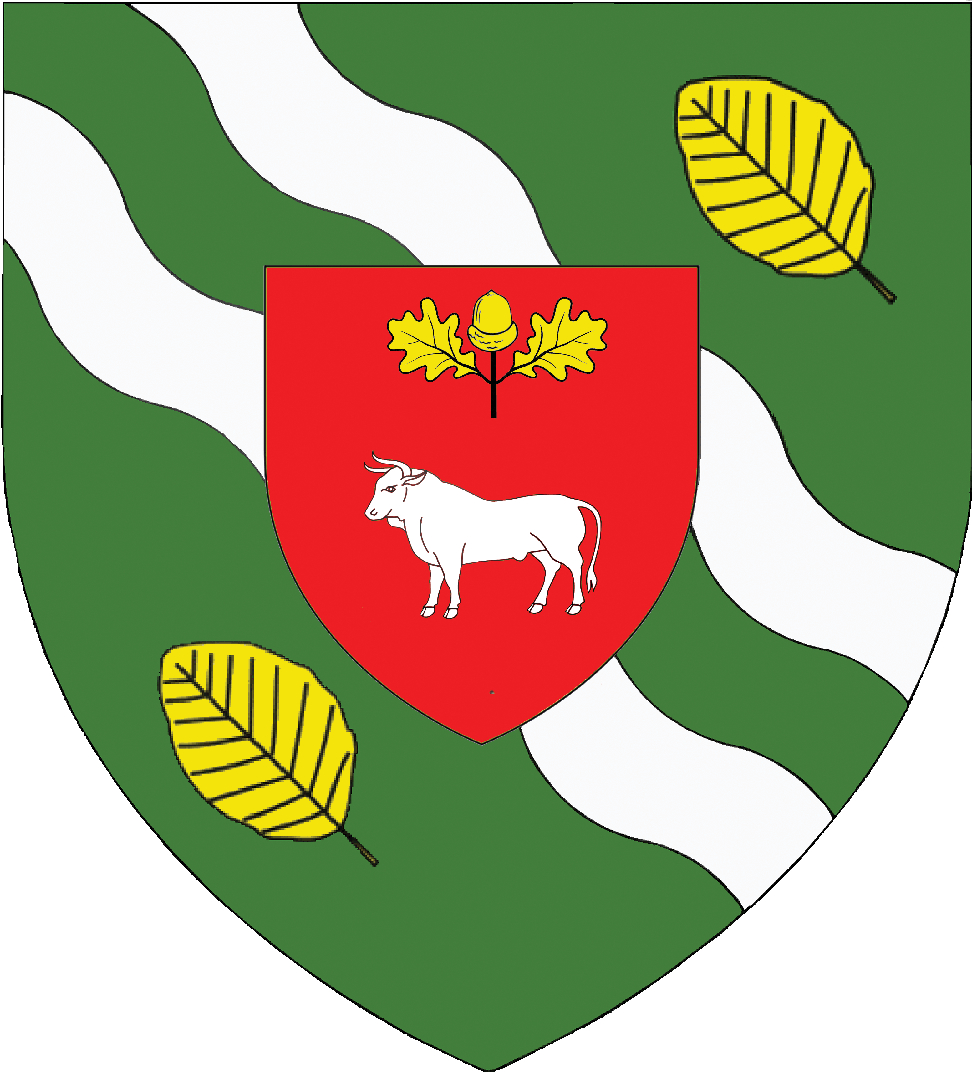 De sinople aux deux cotices ondées d’argent accostées de deux feuilles de verne d’or posées en bande, à l’écusson de gueules au bœuf aussi d’argent surmonté d’un gland versé d’or, tigé et feuillé de deux pièces du même, brochant en abîme.
